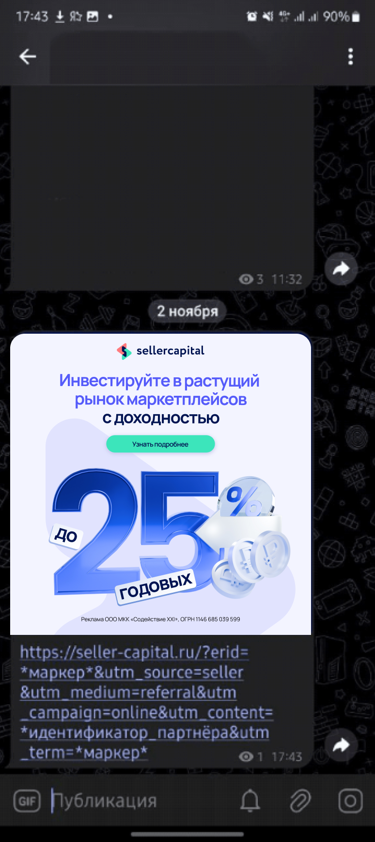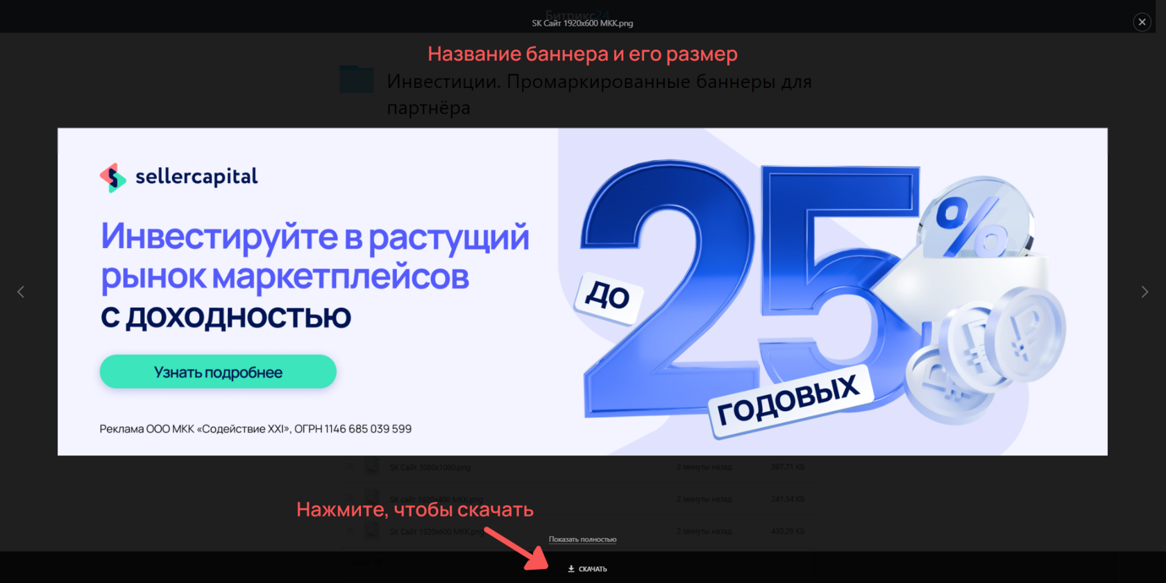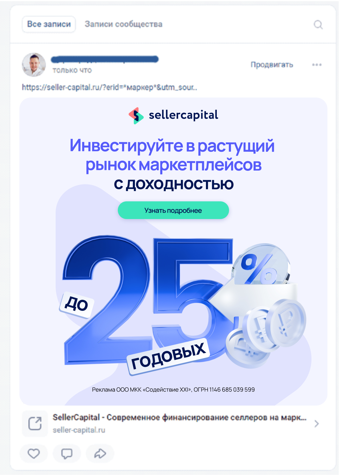 - Ссылку на рекламные материалы можно запросить у менеджера Seller Capital: ord@seller-capital.ru